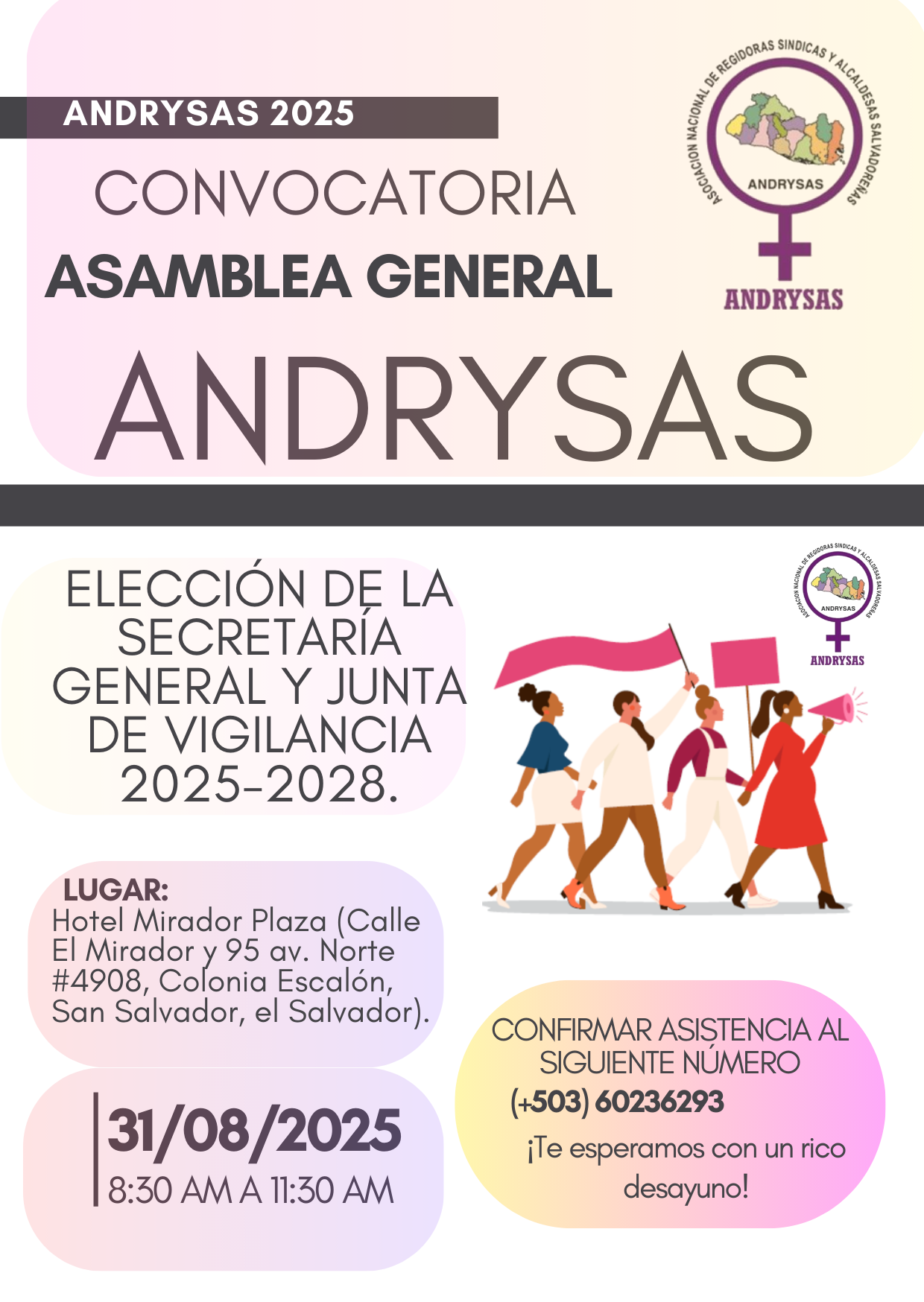 Con base al artículo veintidós “De las atribuciones de la Secretaría General”, de lo establecido en los Estatutos de la organización, la Secretaria General Nely Esmeralda Vindel Arana y la Junta Directiva de ANDRYSAS, tienen el honor de convocar a todas las socias a la:
